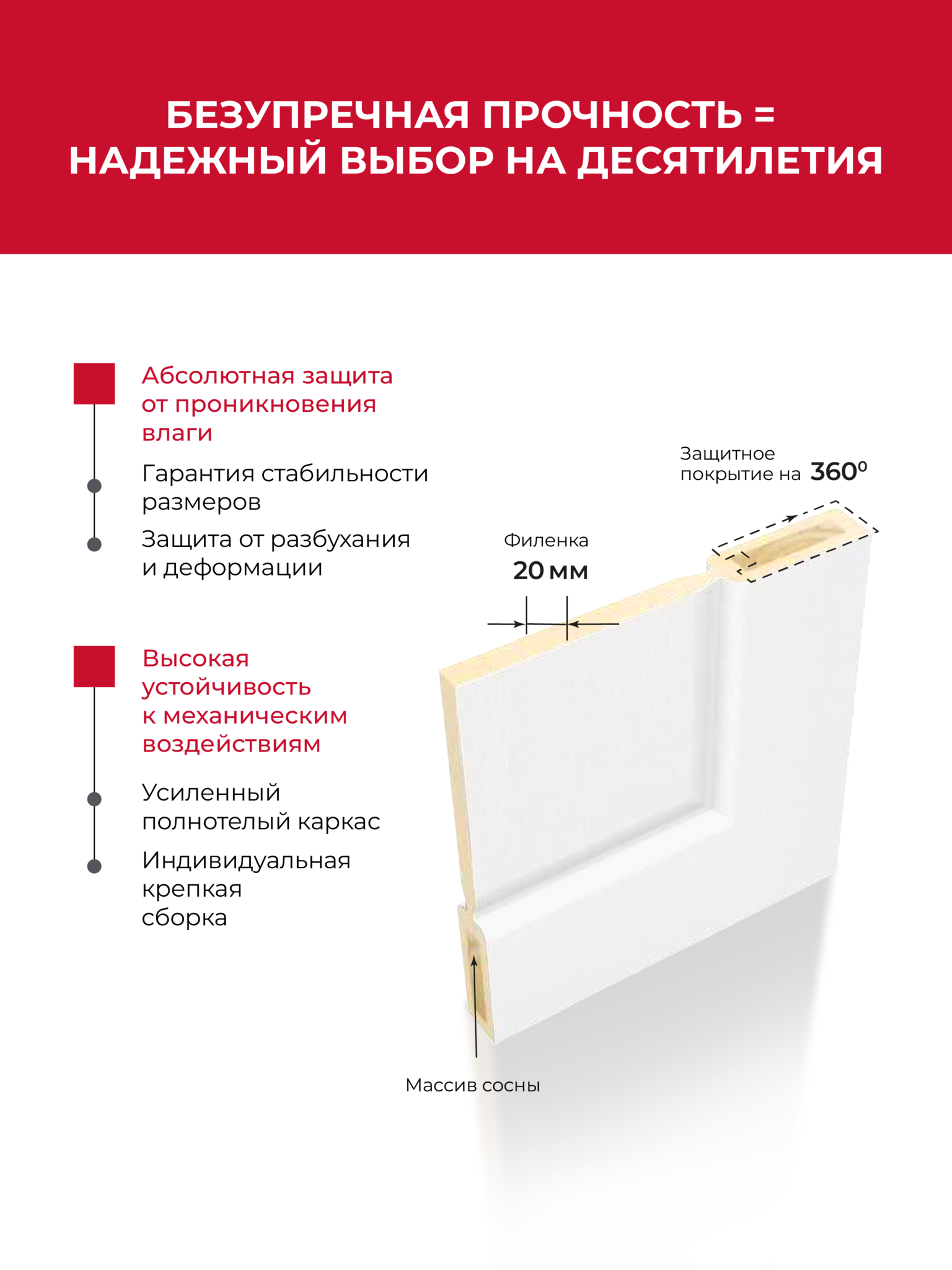 Конструкция дверей – царговая, очень прочная: стоевые из массива сосны и внутреннее наполнение толщиной 20 мм, крепкая сборка гарантируют стабильность геометрии полотна и устойчивость к регулярным механическим нагрузкам. Двери имеют высокий уровень шумоизоляции, поэтому идеально изолируют пространства и создают комфортную атмосферу.