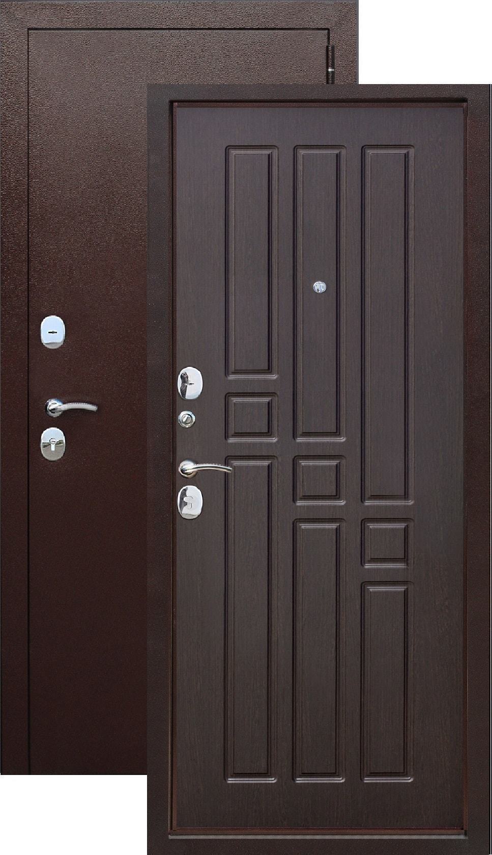 Дверь имеет хорошую прочность из-за толщины металла 1,2 мм. Оснащена двумя надежными замками, минимум один из которых имеет высокий третий класс взломостойкости по ГОСТ 5089-2003 и обладает повышенными охранными свойствами. Есть ночная задвижка — дополнительная защита от взлома. Никто не сможет зайти, вскрыв замок, когда вы дома.