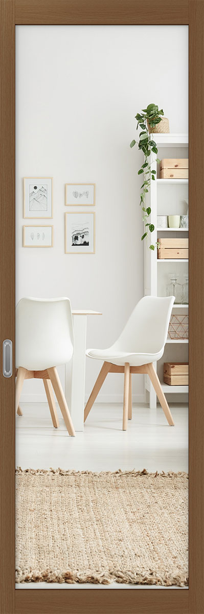Такой вариант можно считать очень практичным и универсальным, поскольку подходит он к самым разным интерьерам в оформлении помещений. Часто такую дверь ставят в небольших комнатах, чтобы зрительно увеличить пространство.