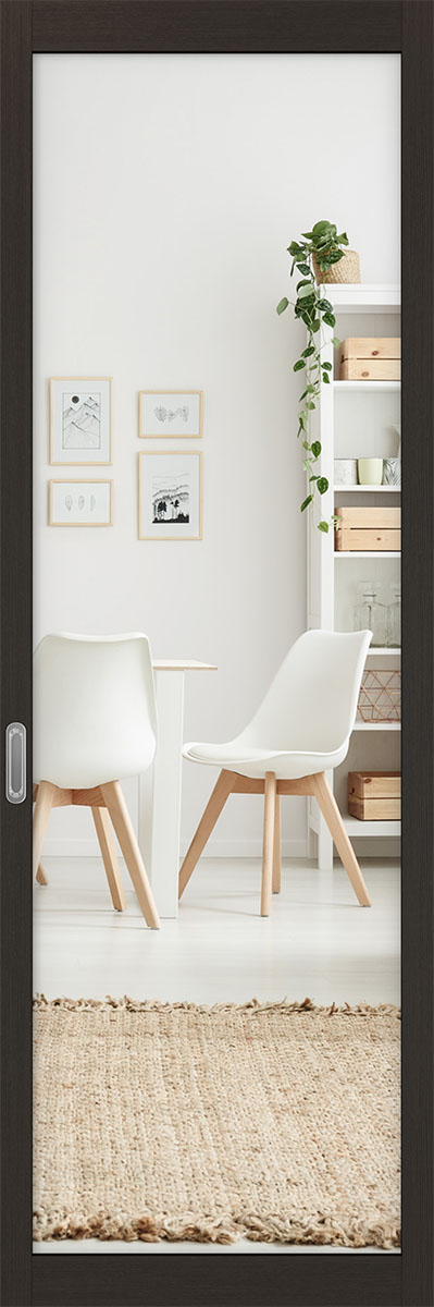 Такой вариант можно считать очень практичным и универсальным, поскольку подходит он к самым разным интерьерам в оформлении помещений. Часто такую дверь ставят в небольших комнатах, чтобы зрительно увеличить пространство.