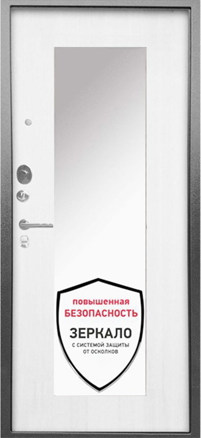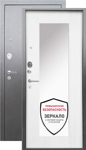 Повышенной надежности российская сейф-дверь с большим зеркалом на внутренней панели. Прекрасно подойдет для установки в квартиру. Солидная модель, которая хорошо защитит и подчеркнет статус.