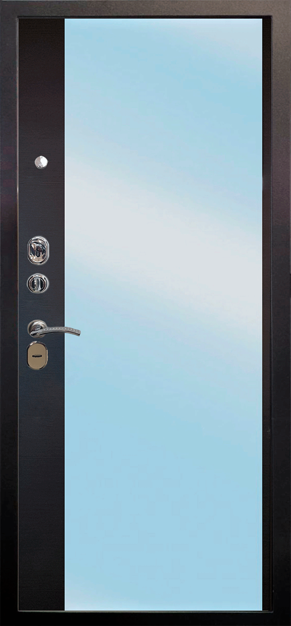 Повышенной надежности российская дверь с большим зеркалом на внутренней панели со стильной внешней отделкой муар черный. Прекрасно подойдет для установки в квартиру. Солидная модель, которая хорошо защитит и подчеркнет статус.