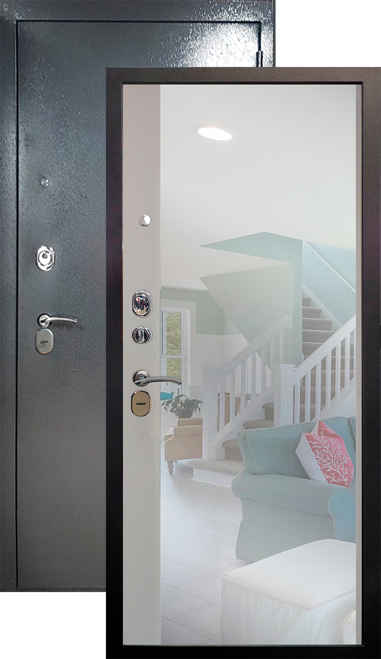 Повышенной надежности российская дверь с большим зеркалом на внутренней панели. Прекрасно подойдет для установки в квартиру. Солидная модель, которая хорошо защитит и подчеркнет статус.