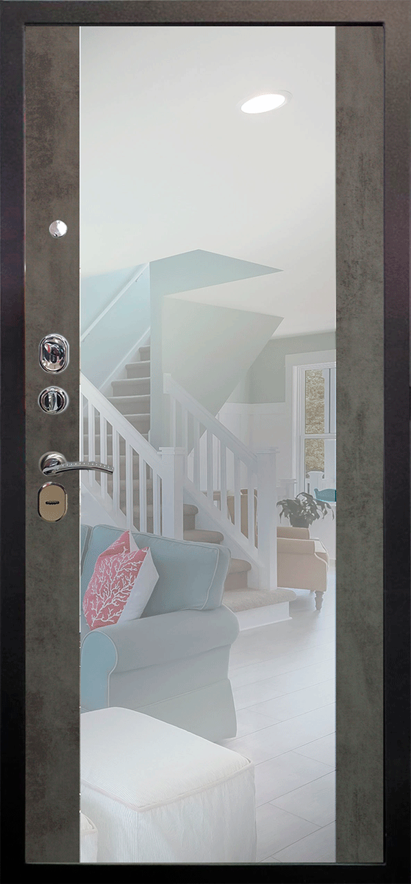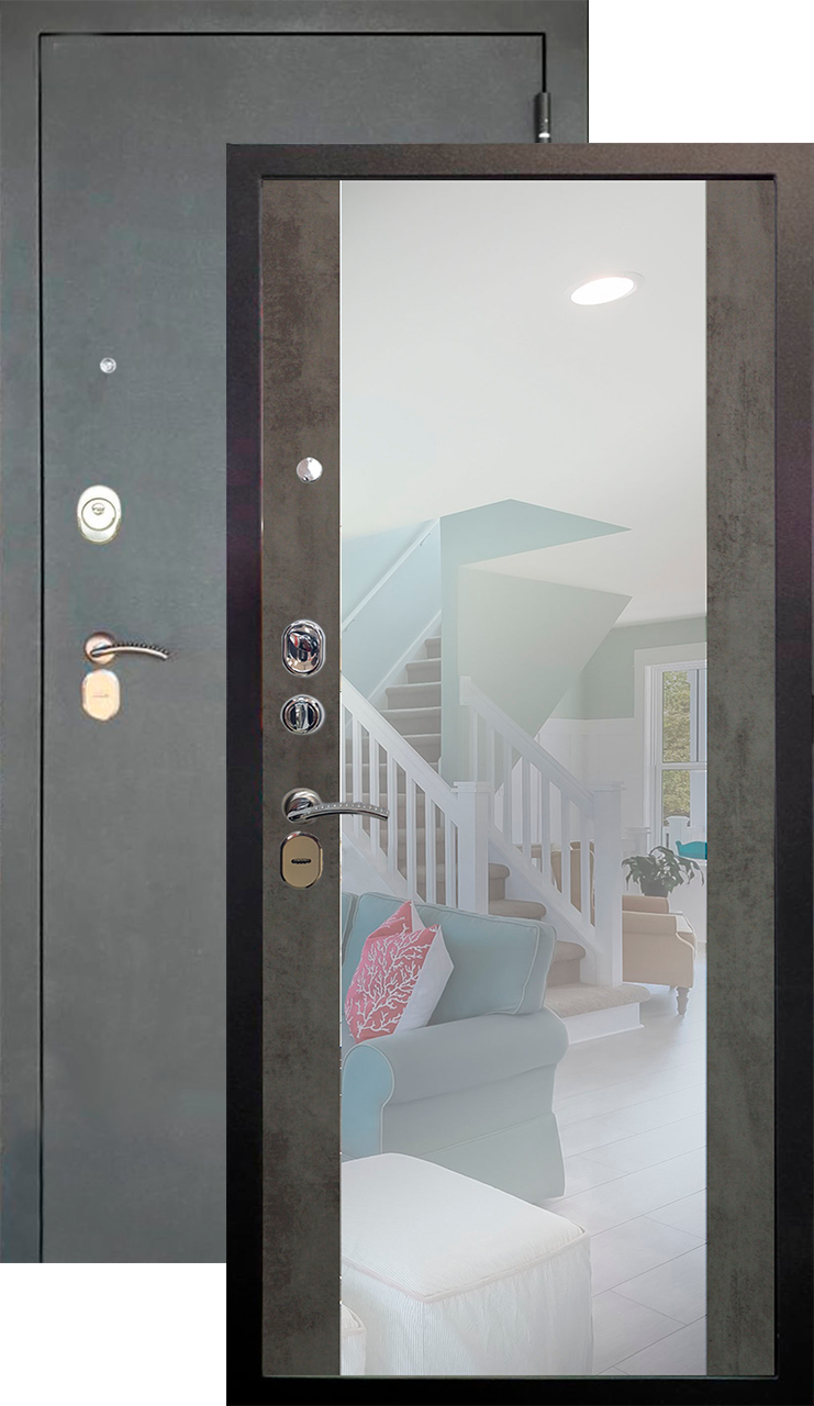 Повышенной надежности российская дверь с большим зеркалом на внутренней панели со стильной внешней отделкой муар черный. Прекрасно подойдет для установки в квартиру. Солидная модель, которая хорошо защитит и подчеркнет статус.