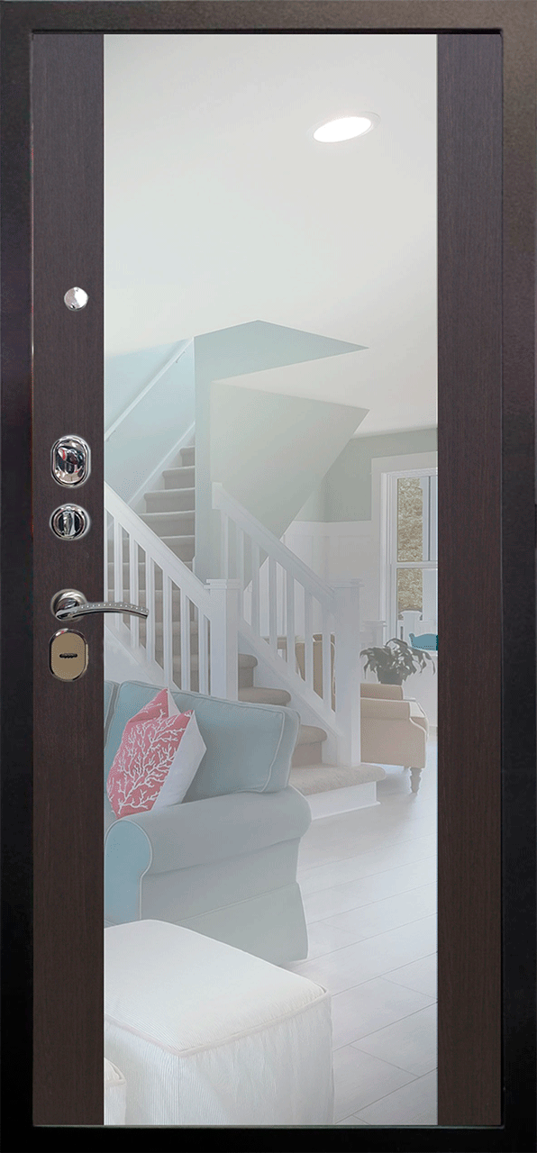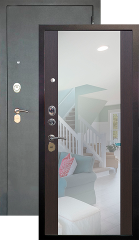Повышенной надежности российская дверь с большим зеркалом на внутренней панели со стильной внешней отделкой муар черный. Прекрасно подойдет для установки в квартиру. Солидная модель, которая хорошо защитит и подчеркнет статус.
