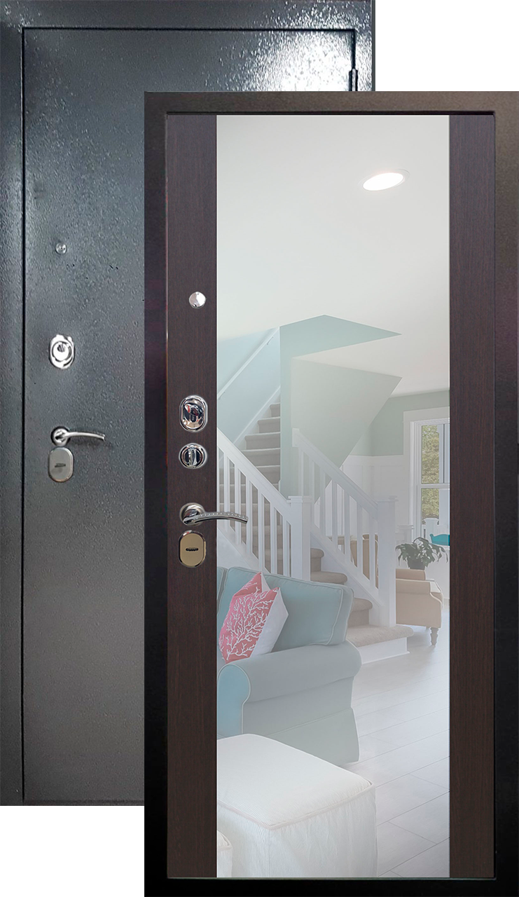 Теплая дверь входная Алекс дорс Вояж зеркало, 2 замка, 1,5 мм металл, (серебро антик+венге)