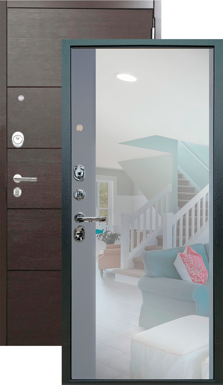 Повышенной надежности российская сейф-дверь с большим зеркалом на внутренней панели. Прекрасно подойдет для установки в квартиру. Солидная модель, которая хорошо защитит и подчеркнет статус.