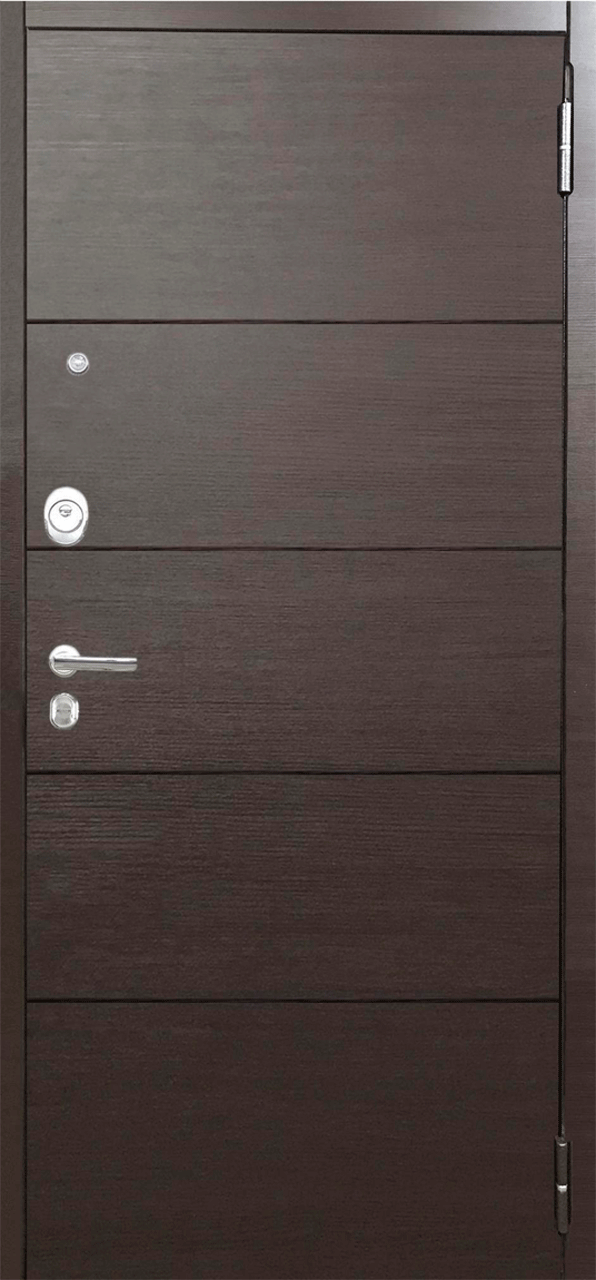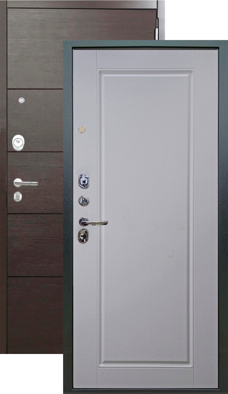 Имеет высокую прочность, благодаря толщине стали 1,8 мм. Оснащена двумя надежными замками, минимум один из которых имеет высший класс взломостойкости по ГОСТ 5089-2003 (4 класс). Есть врезная броненакладка, защищающая цилиндровый замок от высверливания. Она утоплена в дверное полотно, поэтому ее практически невозможно сбить. Есть ночная задвижка — дополнительная защита от взлома. Никто не сможет зайти, вскрыв замок, когда вы дома.
