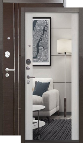 Повышенной надежности российская сейф-дверь с большим зеркалом на внутренней панели. Прекрасно подойдет для установки в квартиру. Солидная модель, которая хорошо защитит и подчеркнет статус.