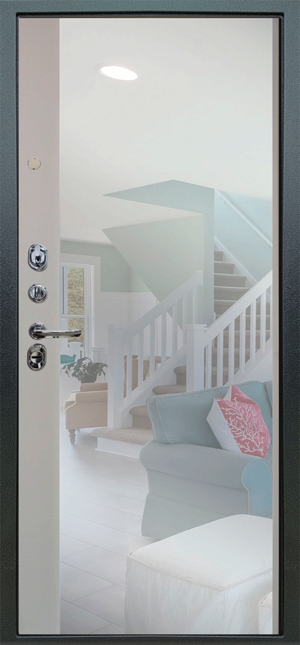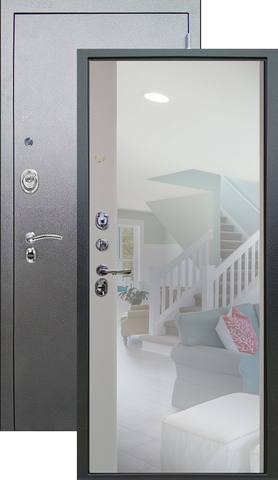 Повышенной надежности российская сейф-дверь с большим зеркалом на внутренней панели. Прекрасно подойдет для установки в квартиру. Солидная модель, которая хорошо защитит и подчеркнет статус.
