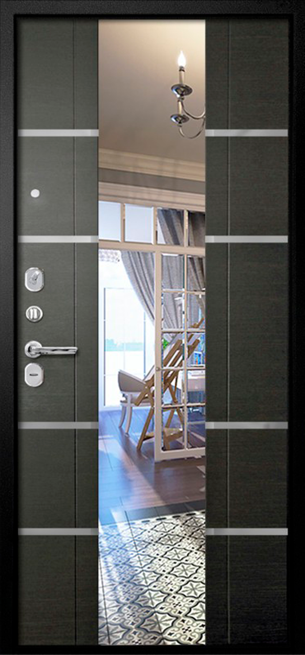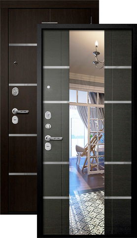 Повышенной надежности российская дверь с большим зеркалом на внутренней панели со стильной внешней отделкой муар черный. Прекрасно подойдет для установки в квартиру. Солидная модель, которая хорошо защитит и подчеркнет статус.