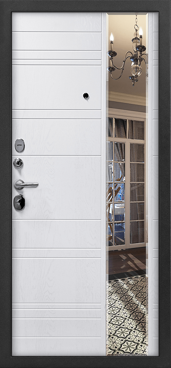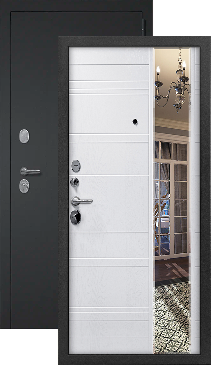 Повышенной надежности российская дверь с большим зеркалом на внутренней панели со стильной внешней отделкой муар черный с блестками. Прекрасно подойдет для установки в частном доме, так как устойчива к перепаду температур, воздействию ультрафиолета и атмосферных осадков. Для установки обязательно нужен холодный тамбур. Солидная модель, которая хорошо защитит и подчеркнет статус.