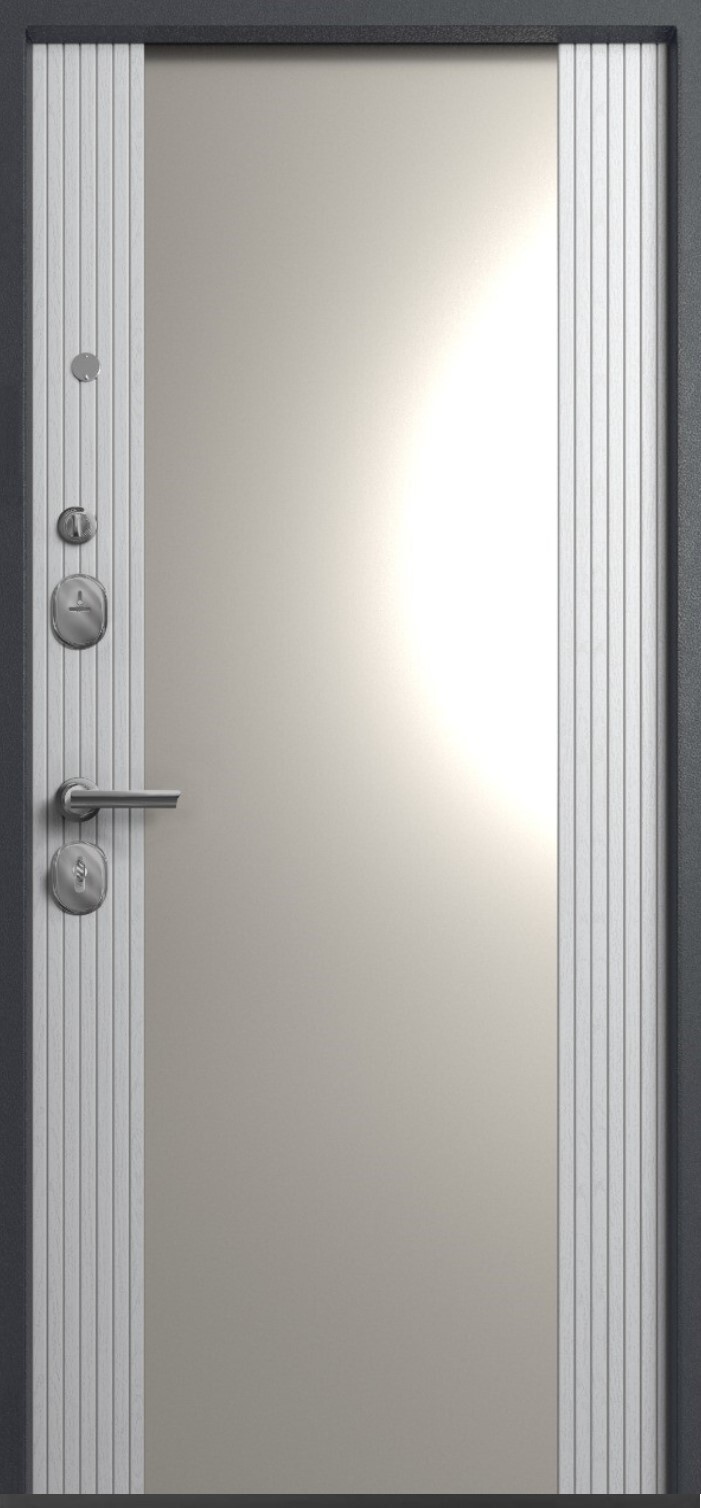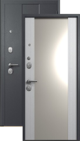 Повышенной надежности российская дверь с большим зеркалом на внутренней панели со стильной внешней отделкой графит муар (RAL7024). Прекрасно подойдет для установки в квартиру. Солидная модель, которая хорошо защитит и подчеркнет статус.