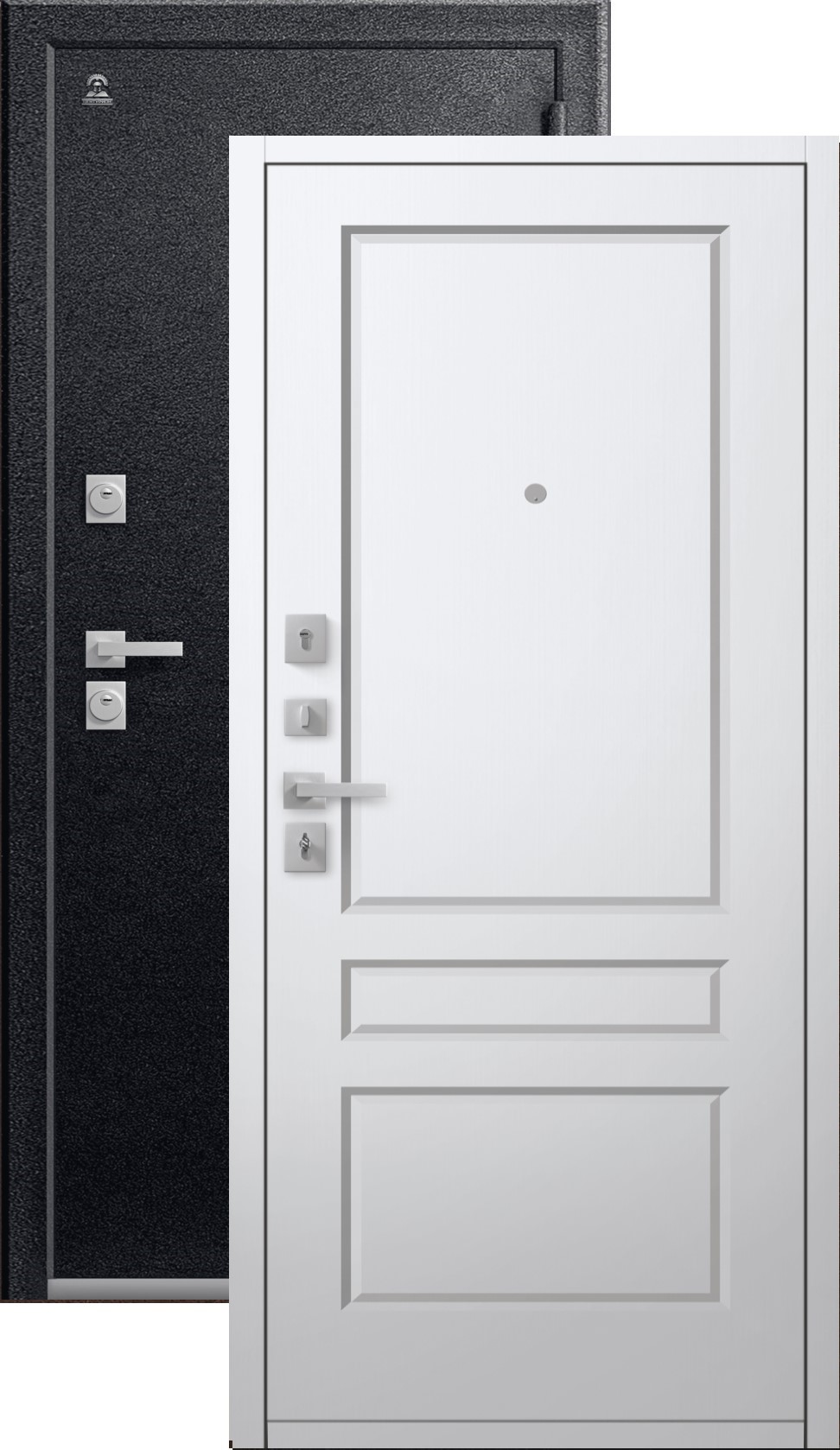 Повышенной надежности российская сейф-дверь со стильной внешней отделкой муар черный и красивой декоративной панелью толщиной 16 в цвете кашемир белый. Прекрасно подойдет для установки в квартиру. Солидная модель, которая хорошо защитит и подчеркнет статус.