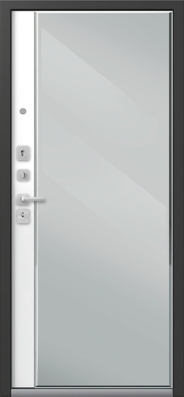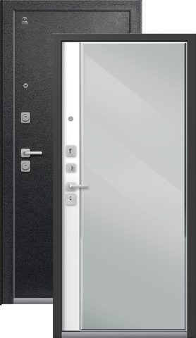 Повышенной надежности российская дверь с большим зеркалом на внутренней панели со стильной внешней отделкой муар черный. Прекрасно подойдет для установки в квартиру. Солидная модель, которая хорошо защитит и подчеркнет статус.