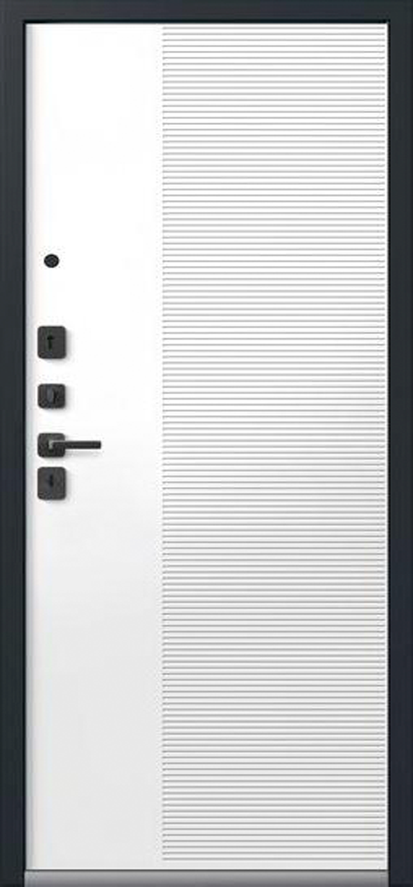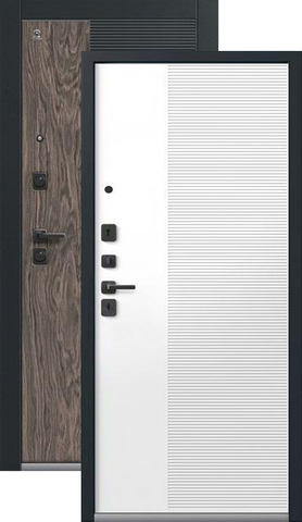 Повышенной надежности российская дверь со стильной внешней отделкой муар черный/кварц черный/орех мокко и красивой декоративной панелью толщиной 16 в цвете белый. Прекрасно подойдет для установки в квартиру. Солидная модель, которая хорошо защитит и подчеркнет статус.
