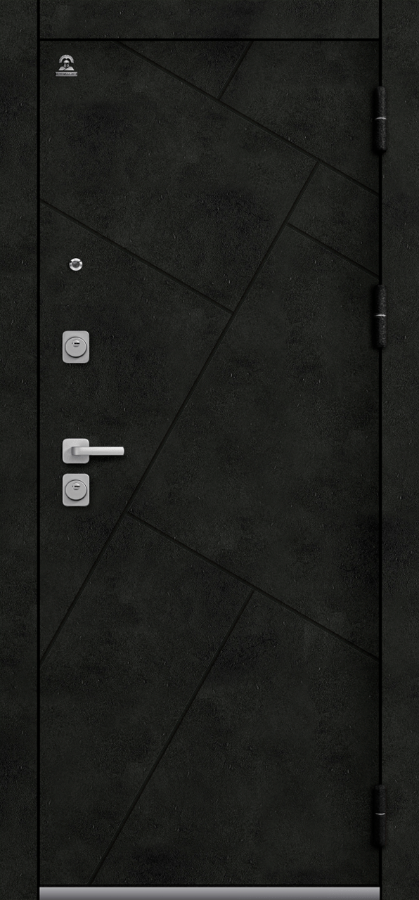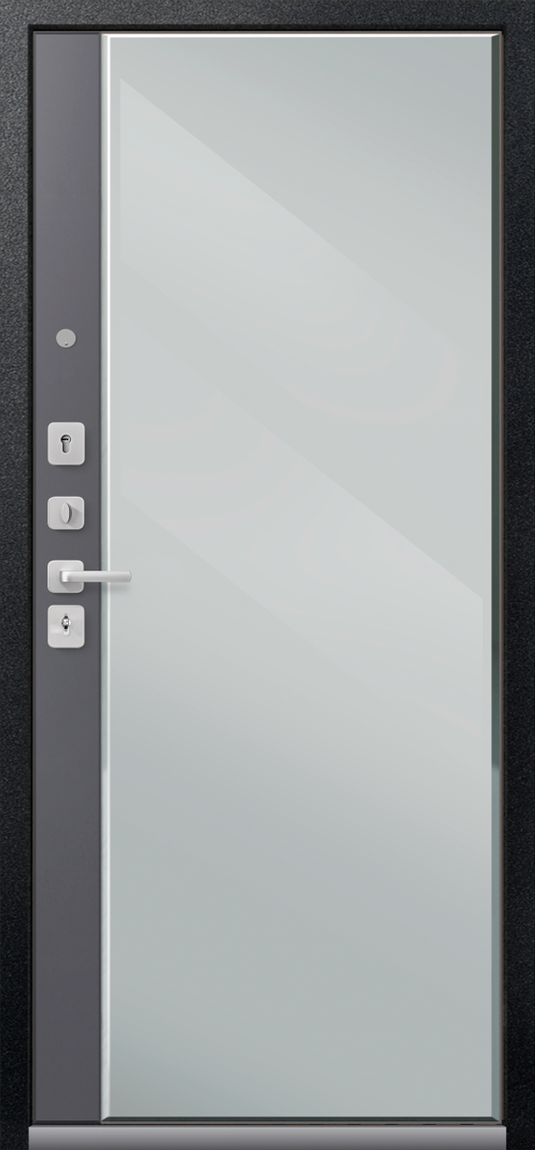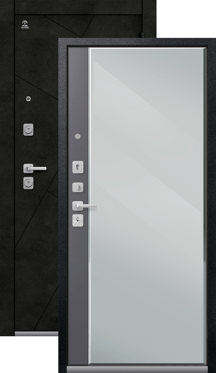 Повышенной надежности российская дверь с большим зеркалом на внутренней панели со стильной внешней отделкой муар черный/бетон темный. Прекрасно подойдет для установки в квартиру. Солидная модель, которая хорошо защитит и подчеркнет статус.