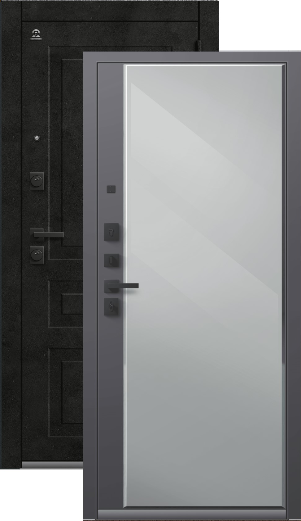 Повышенной надежности российская сейф-дверь с большим зеркалом на внутренней панели со стильной внешней отделкой муар черный/бетон темный. Прекрасно подойдет для установки в квартиру. Солидная модель, которая хорошо защитит и подчеркнет статус.