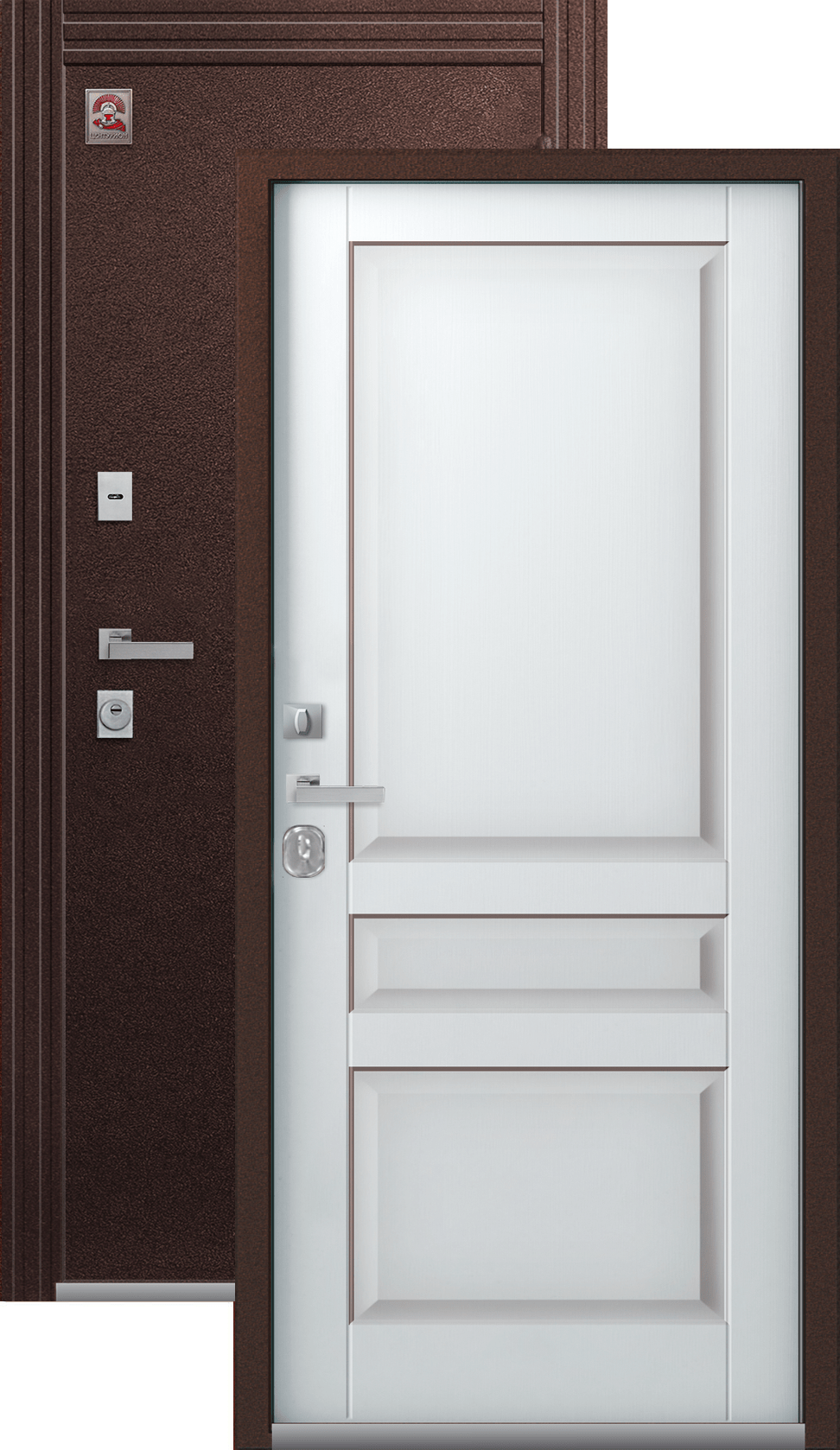 Имеет очень высокую прочность, благодаря толстой стали 2 мм. Оснащена двумя надежными замками, минимум один из которых имеет высший класс взломостойкости по ГОСТ 5089-2003 (4 класс). Есть врезная броненакладка, защищающая цилиндровый замок от высверливания. Она утоплена в дверное полотно, поэтому ее практически невозможно сбить. Есть ночная задвижка — дополнительная защита от взлома. Никто не сможет зайти, вскрыв замок, когда вы дома.